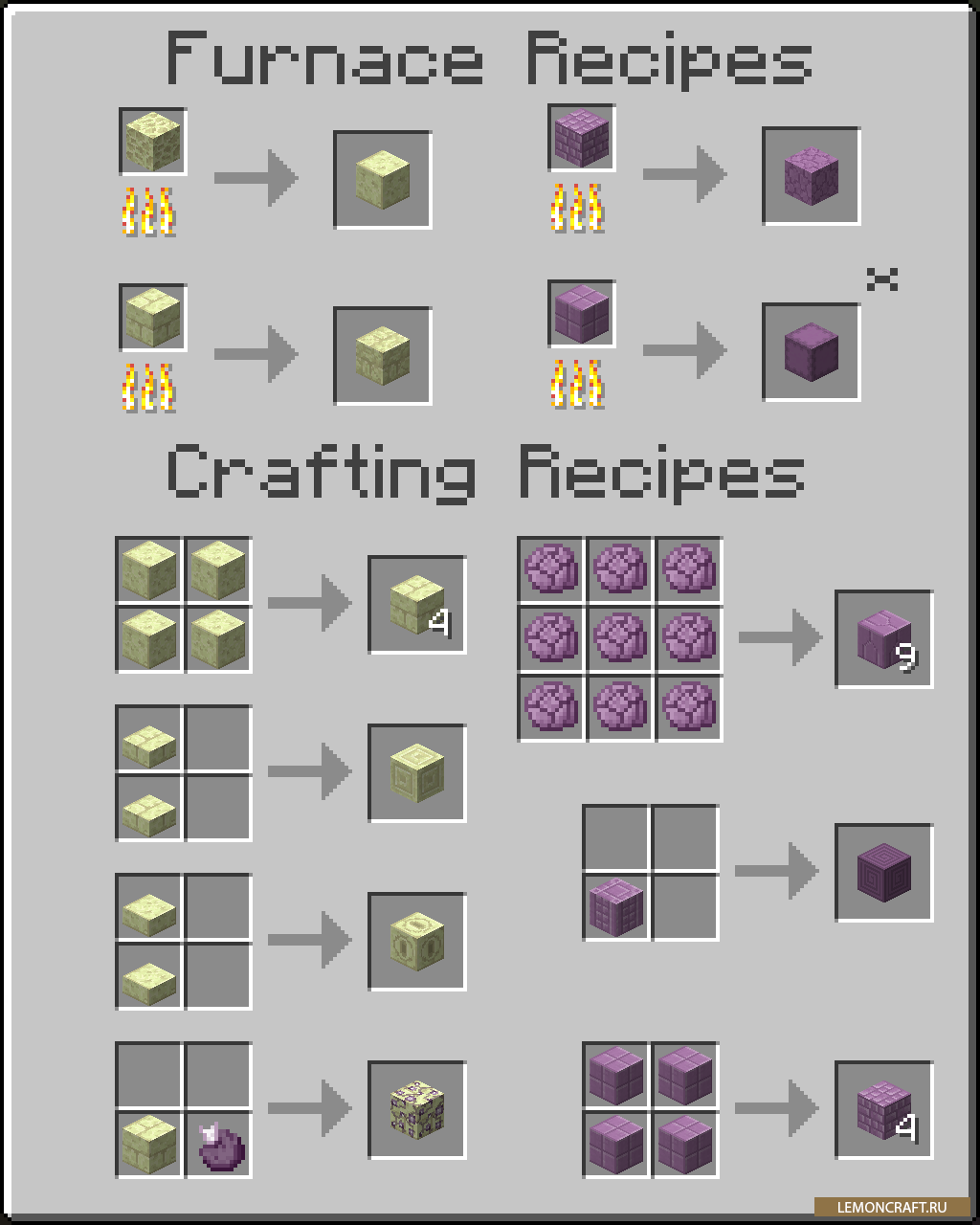 Мод Additional Ender Blocks добавляет в игру новые эндер блоки, которые можно использовать при возведении строений в крае. Новые блоки отлично сочетаются с окружающим миром и будут полезны при строительстве. Кроме этого мод изменяет рецепт каменного кирпича края.